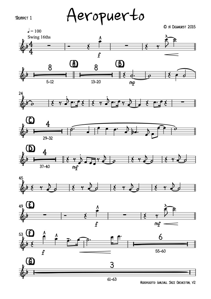 ‘Aeropuerto’ is a steady-funk tune which features Trombone & Alto Sax Soloists. After the catchy main theme, there is plenty of space for solos, followed by a band soli. To finish there is a darker sounding section which allows for trading between the featured soloists. Difficulty level: Intermediate