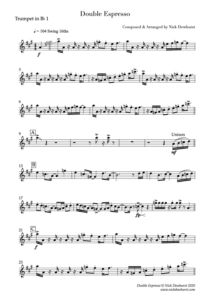 Please enjoy browsing my Big Band Compositions and Arrangements listed below. The charts are all written for 5 Saxes, 4 Trumpets (sometimes 5), 4 Trombones, 4 Rhythm (Pno/Gtr/Bass/Drums), and there is a variety of difficulties (easy, intermediate and advanced). If you’ve any questions, please contact me via email at nick.dewhurst@live.co.uk and I’ll be happy to let you know more information. I hope the charts bring something exciting and original to your Big Band’s current repertoire!